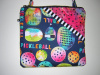 Cotton print in pickleball. The front pocket is in a matching batik with black and white stripe cotton trim. Back is in the pickleball print only