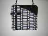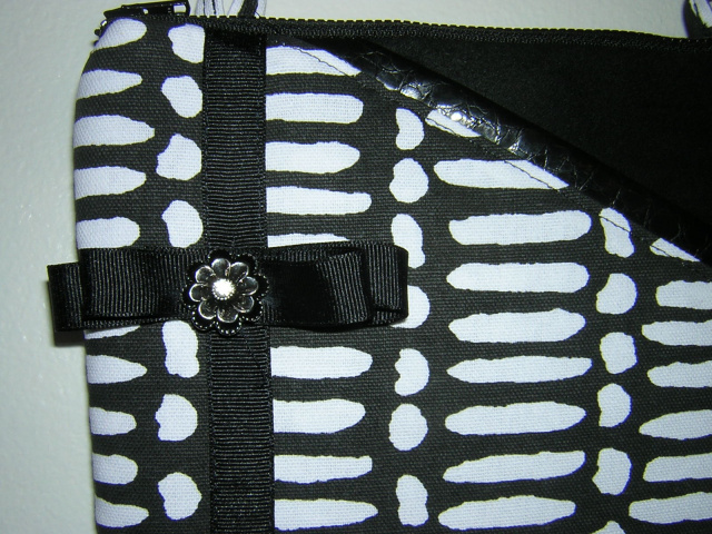 Canvas in black and white line print with black suede front pocket that is ttrimmed with black faux leather. The bag is trimmed with black grosgrain ribbon and to finish the look a silver metal button with stone is used. Back of bag is in the canvas print only.