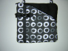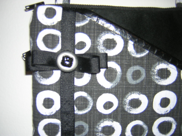 Canvas in a circle print with black, grey, and white. The front pocket is done in suede with a faux leather trim. The bag is trimmed with black grosgrain ribbon and button with stone middle to finish the rich look. Back of bag is in the circle print only