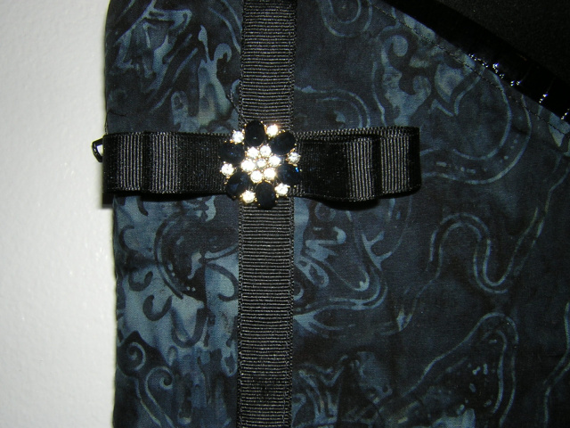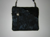 Cotton batik in a black navy swill print with a black suede front pocket that is trimmed with faux leather. The bag is trimmed with black grosgrain ribbon and a large stone button in navy and crystals. The back of bag is in the batik print only