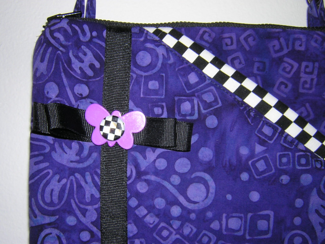 Cotton print in a retro purple with a matching print in pocket and trimmed with black and white check cotton. The bag is trimmed with black grosgrain ribbon and bow with a stacked butterfly button. The back is in the retro print only