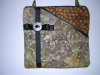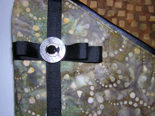Cotton batik in a fun print with a matching batik front pocket that is trimmed with black vegan leather. The bag is trimmed with black grosgrain ribbon and bow with a stack button to finish the look. Back is in the line print only.