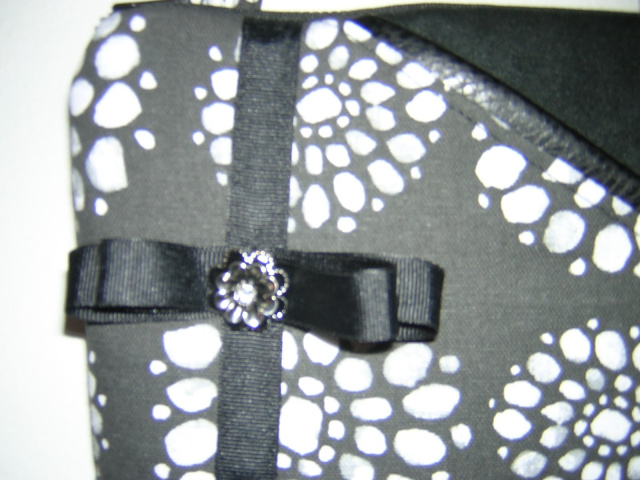 Canvas print with the front pocket in a black ultra suede trimmed with vegan leather. The bag is trimmed with grosgrain ribbon and bow with a metal flower and rhinestone center. Back of bag is in the canvas print only