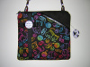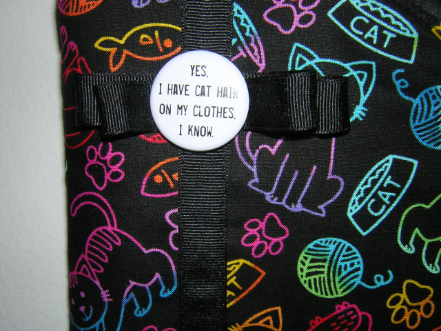 Cotton print in a hot kitty. The front pocket is done in black ultra suede with a vegan leather trim. The bag is trimmed with black grosgrain ribbon and bow with a custom button. The back of bag is done in the cat print only.