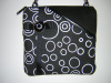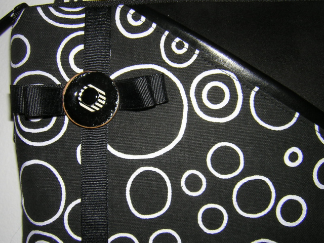 Canvas in black and white circles with the front pocket in black ultra suede trimmed with vegan leather. The bag is trimmed with black grosgrain ribbon and bow with a stacked button to finish the look. The back is in the circle print only.