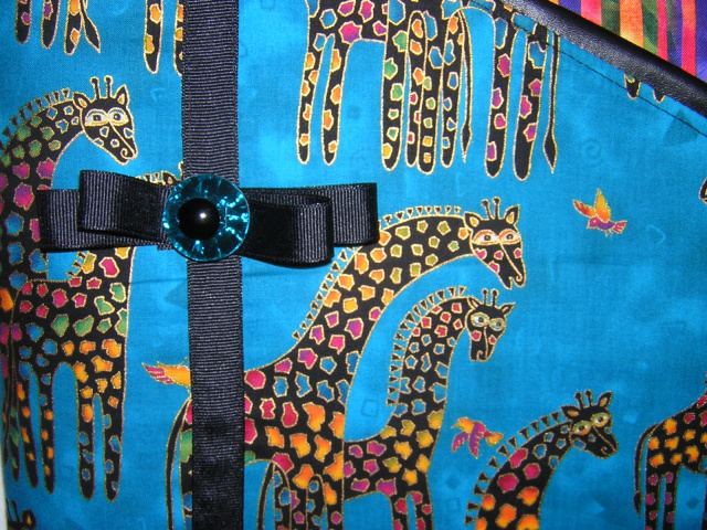 Cotton gold glitted giraffe print with a matching cotton hot color pocket that is trimmed in black vegan leather . The bag is trimmed with black grosgrain ribbon and bow with a stacked crystal button. Back of bag in cotton print only