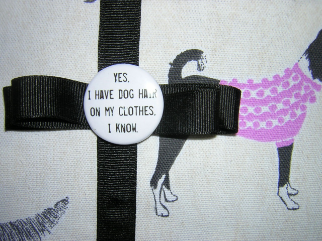 A dog print with a black ultra suede front pocket trimmed with black vegan leather. The bag is trimmed with black grosgrain ribbon and bow with a custom button to finish the look. The back of bag is in the dog print only.