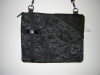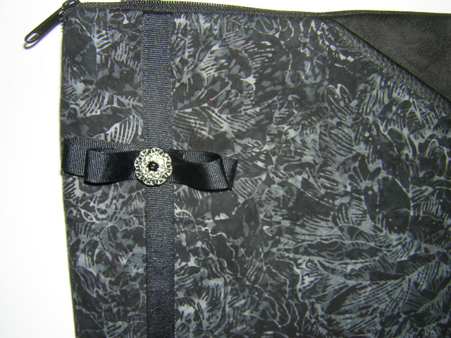 Cotton batik in a floral print with the front pocket in black ultra suede and trimmed with black vegan leather. The bag is trimmed with black grosgrain ribbon and bow with a silver crystal button. Back of bag is done iin the batik print only